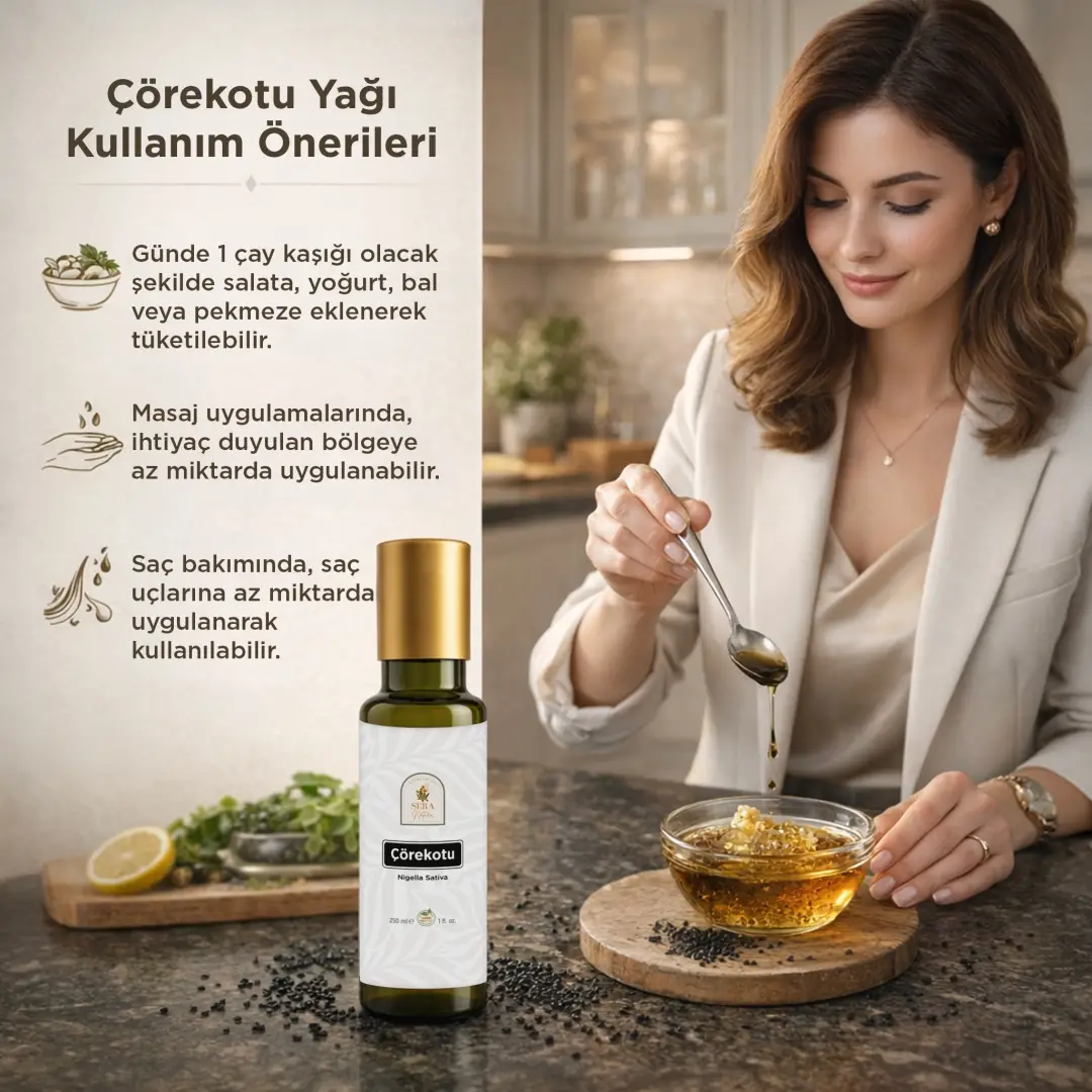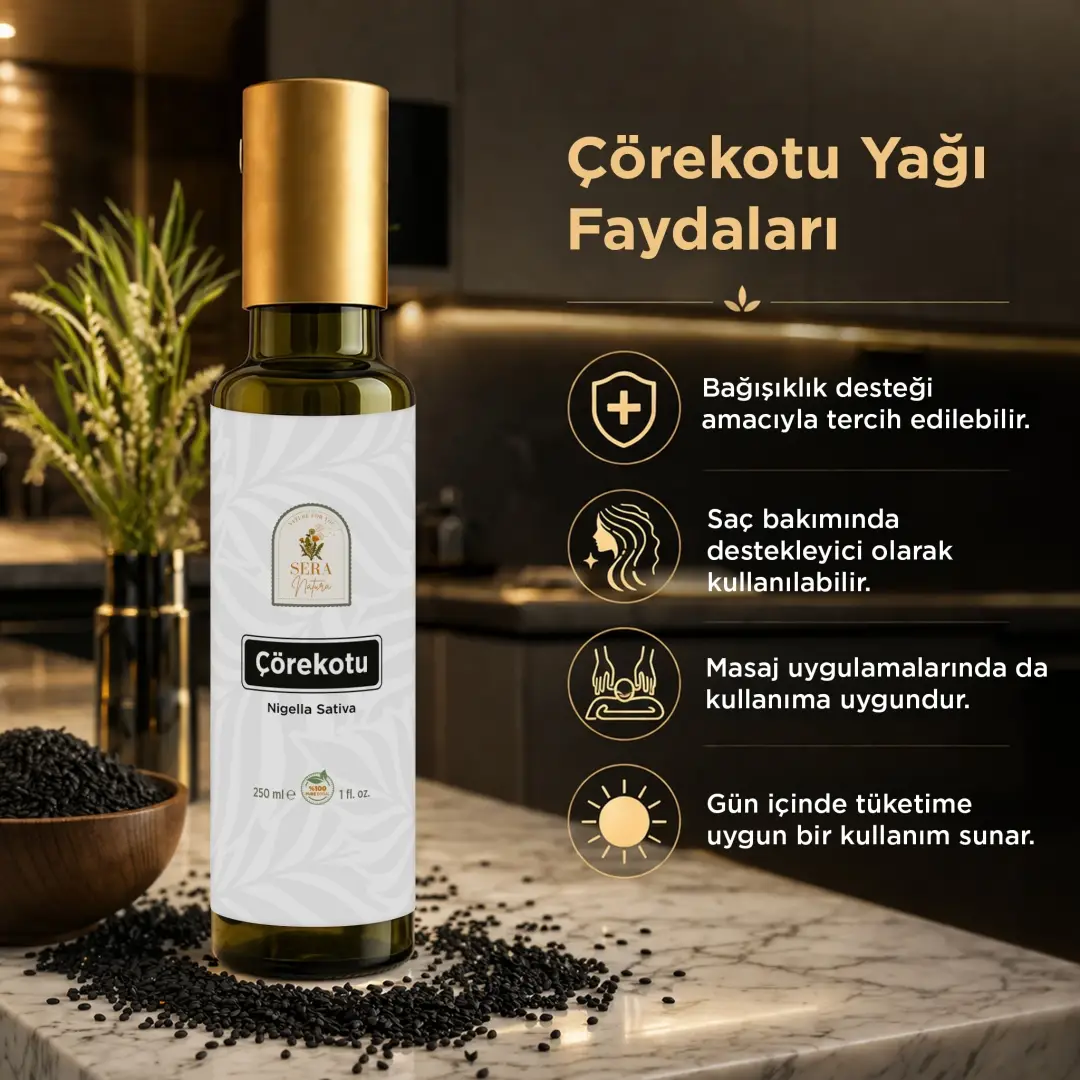 Sera Natura Çörekotu Yağı, sade içeriği ve soğuk sıkım üretim yöntemiyle öne çıkar. Timokinon, omega-6 ve omega-9 gibi doğal bileşenleriyle hem gıda olarak tüketim hem de harici kullanım için tercih edilen bitkisel yağ seçeneklerinden biridir.