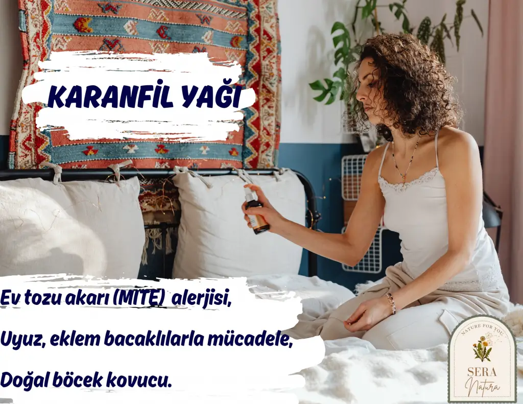 • Sinek Kovucu: Karanfil yağı, sinekler ve diğer böceklerden korunmak amacıyla doğal bir sinek kovucu olarak kullanılır.