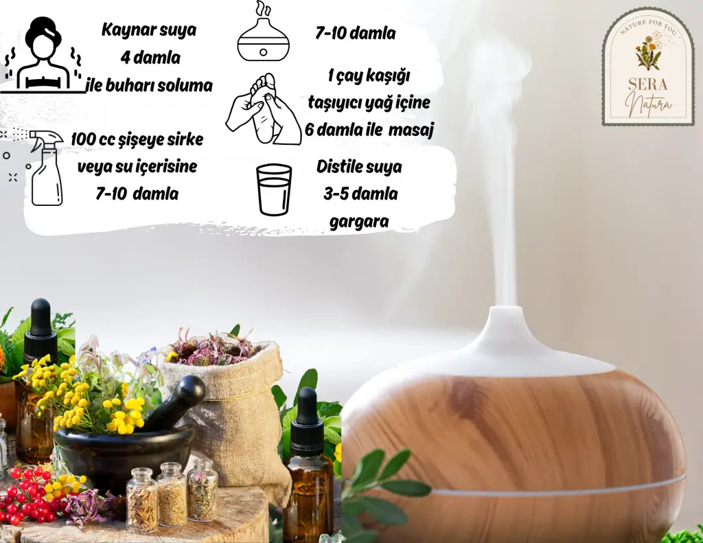 • Difüzöre 7-10 damla damlatarak mikrop kırıcı ve ortam temizleyici oda kokusu için kullanabilirsiniz