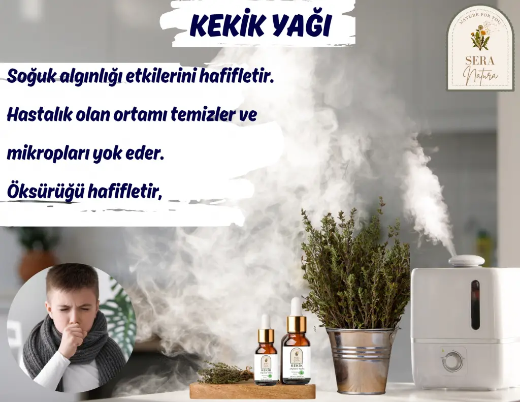• Solunum Yolu Sorunları: Kekik yağı, özellikle soğuk algınlığı veya sinüzit gibi solunum yolu sorunlarını hafifletmek için buhar inhalasyonları veya buhar banyoları için kullanılır. Öksürük giderici olarak çocuk ve yetişkenlerde topuk bölgesine masaj uygulaması da yapılır.