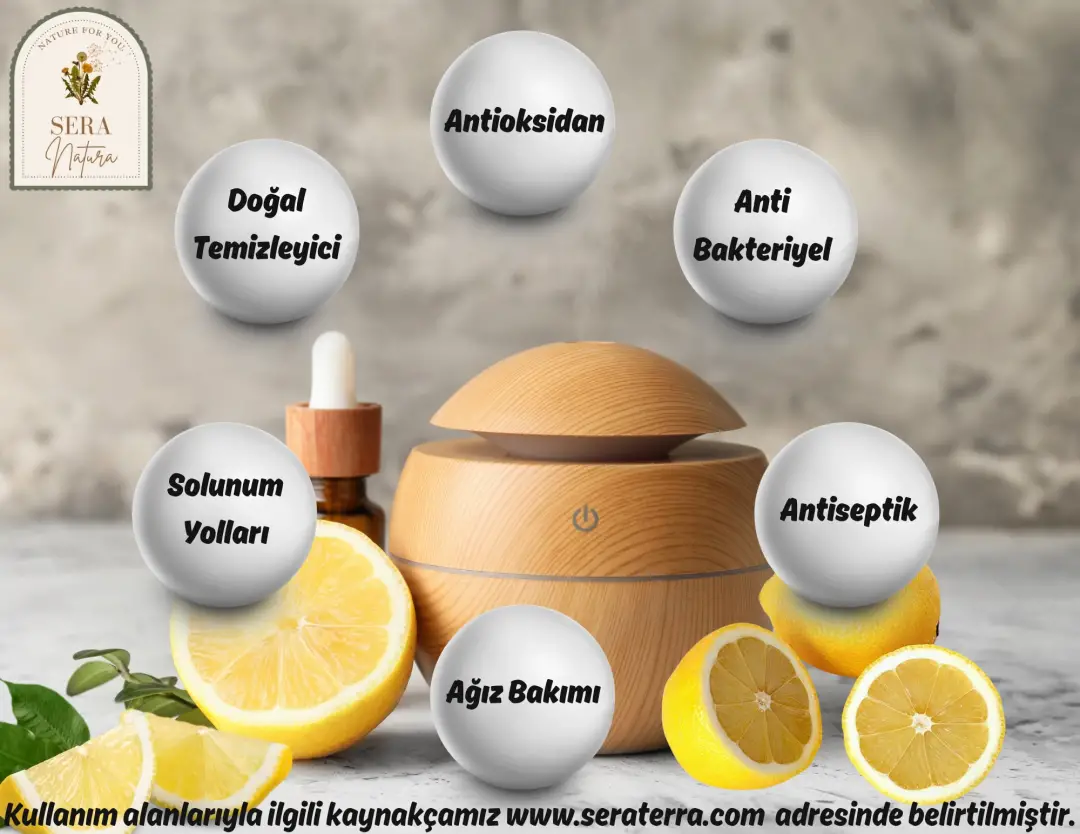 Aromaterapi: Limon kabuğu uçucu yağı, aromaterapi uygulamalarında yaygın olarak kullanılır. Bu yağ, enerji verici ve canlandırıcı bir kokuya sahiptir. Stresi azaltmaya, zihinsel netliği artırmaya ve pozitif duygusal durumu teşvik etmeye yardımcıdır.