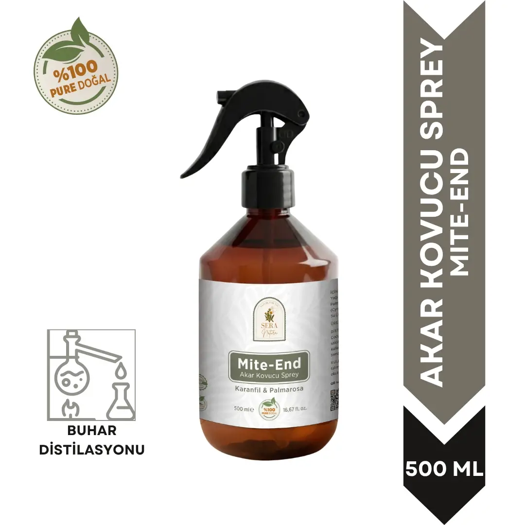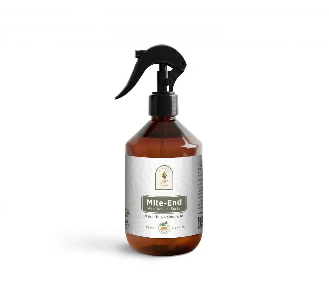 Ev tekstillerinde oluşabilen akar sorunlarına karşı bitkisel içeriklerle formüle edilen Sera Natura Mite-End Akar Kovucu Sprey, düzenli kullanımda daha hijyenik ve ferah bir yaşam alanı oluşturmayı destekler. %100 saf ve doğal içeriği sayesinde kimyasal kalıntı bırakmaz. Karanfil ve palmarosa uçucu yağları, buhar distilasyonu yöntemiyle elde edilmiştir. Ürün kullanıma hazır olarak gönderilir, ekstra bir katkı eklenmesine gerek yoktur.