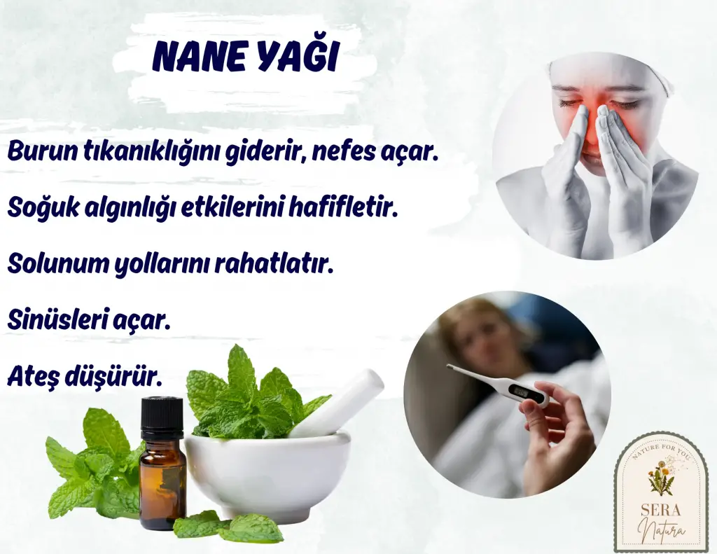 • Solunum Yolları Sorunları: Soğuk algınlığı veya sinüzit gibi problemleriniz için nane yağı buharını solumak veya bir buhar makinesine eklemek yardımcı olabilir.