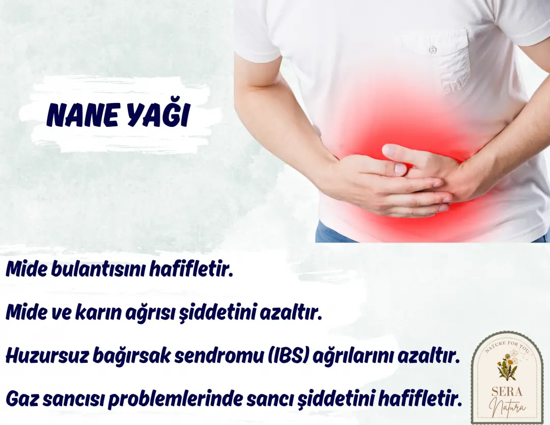 Mide Rahatsızlıkları: Sindirim problemleri, mide ağrısı veya mide bulantısı durumunda, bir bardak suya birkaç damla nane yağı ekleyerek içebilirsiniz. Ancak nane yağını içerken dikkatli olunuz çünkü yüksek dozlarda kullanılması mide rahatsızlıklarını artırabilir.