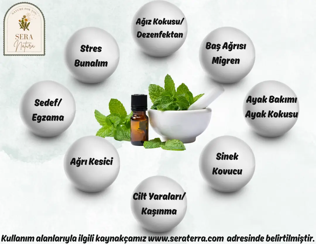 Baş Ağrısı Tedavisi: Baş ağrısı veya migren gibi rahatsızlıklarla başa çıkmak için birkaç damla nane yağını şakaklarınıza hafifçe masaj yaparak veya buharını solumak suretiyle kullanabilirsiniz.