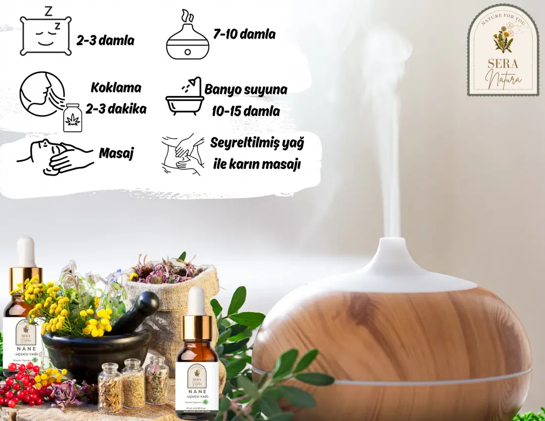 Nefes Açıcı: Nane yağını aromaterapi amacıyla kullanabilirsiniz. Difüzöre birkaç damla nane yağı damlatarak odayı ferahlatabilirsiniz. Nane yağının buharını solumak, rahatlamanıza yardımcı olur ve solunum yollarını açar.