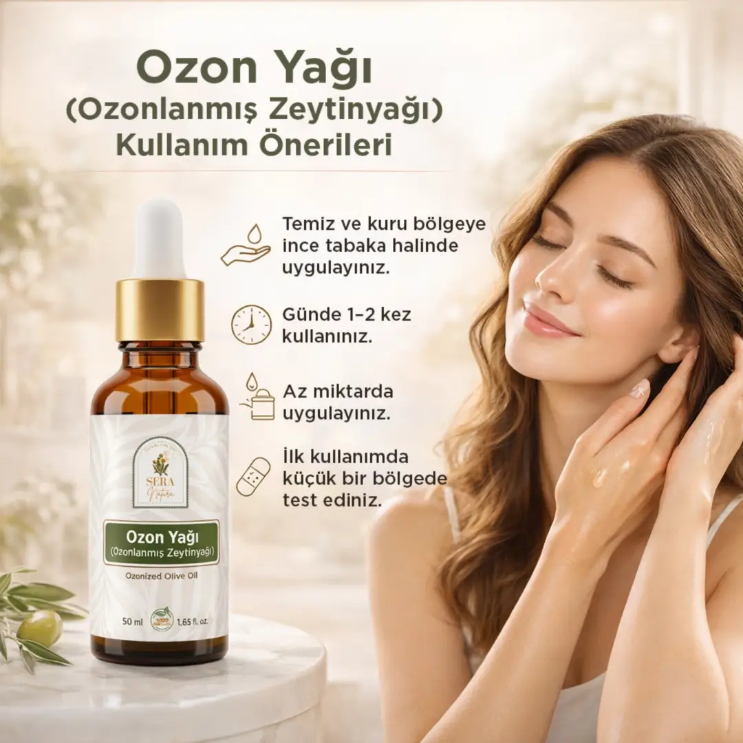 Sera Natura Ozon Yağı (Ozonlanmış Zeytinyağı), seçilmiş yüksek kaliteli soğuk sıkım natürel zeytinyağının kontrollü ve standardize edilmiş ozonizasyon sürecinden geçirilmesiyle üretilir. Bu özel işlemle yağ, aktif oksijen bileşikleri ile zenginleşir; kontrollü ozonizasyon sonrası standart zeytinyağına göre daha kıvamlı ve dengeli bir yapıya ulaşır. Jel veya katı formda değildir. Harici kullanım için geliştirilmiş fonksiyonel bakım ürünüdür.