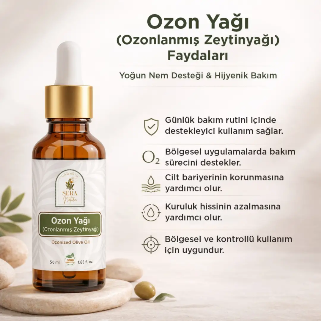 Sera Natura; şeffaf içerik yaklaşımı, kontrollü üretim disiplini ve fonksiyonel bakım ürünleriyle öne çıkan bir markadır. Ozon Yağı (Ozonlanmış Zeytinyağı) 50 ml; seçilmiş soğuk sıkım zeytinyağının standardize ozonizasyon süreciyle hazırlanmış, kıvamlı ve akışkan formda premium bakım yağıdır.