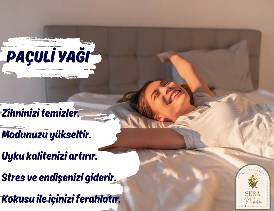 Aromaterapi: Paçuli yağı, rahatlatıcı ve zihinsel denge sağlama potansiyeline sahiptir. Stresin azaltılması, uykusuzluğun giderilmesi ve zihinsel rahatlama için paçuli yağı kullanılır.